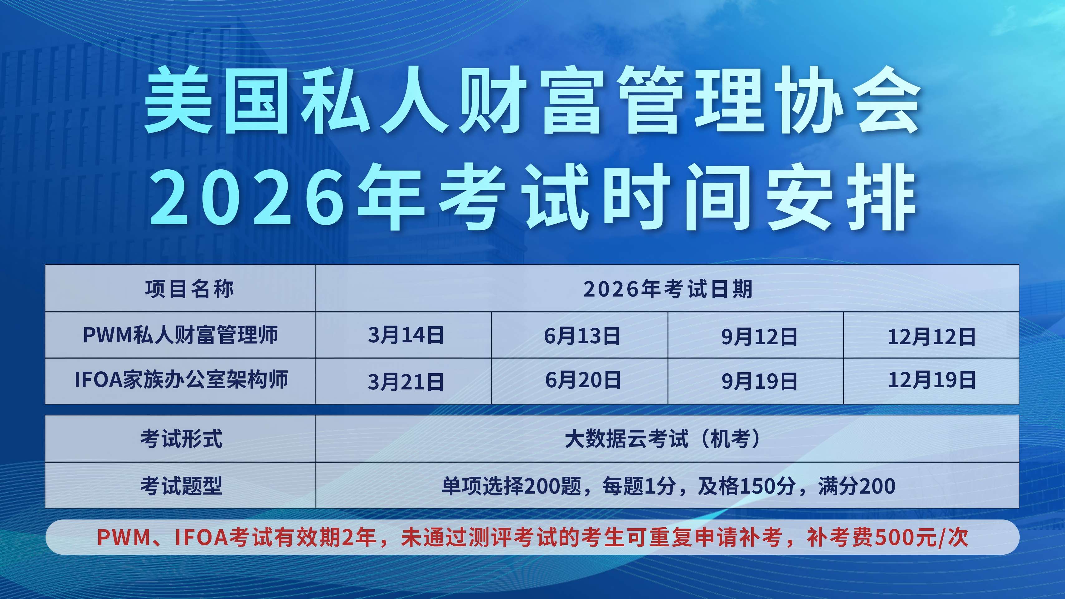PWM考试施行一试双证,考生通过考试且成绩合格,可获得由美国私人财富管理协会注册、签发的“私人财富管理师”“家族财富管理师”对应考试等级的双认证国际注册专业资格证书。