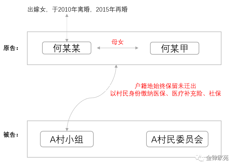 何某某系出嫁女,虽出嫁但户口仍保留原籍,在A村小组享有土地承包经营权。女儿何某甲的户口也一直随母亲在该组。2010年何某某离婚,其与女儿何某甲在A村小组居住生活。2015年何某某虽再婚,但其与女儿户口仍在A村小组未迁出。