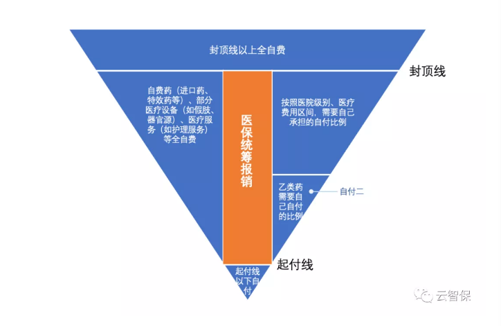 我先做了个倒三角图来示意一下,蓝色部分都是自费的,橙色部分是医保报销的。